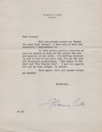Hollywood FLORENCE VIDOR SIGNED AUTOGRAPH FAN LETTER 1930s ORIG Photo 514