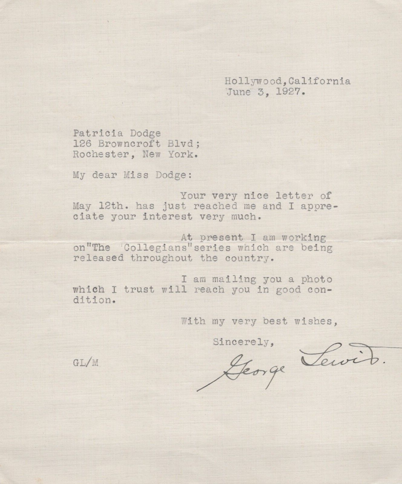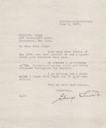 Hollywood GEORGE LEWIS SIGNED AUTOGRAPH FAN LETTER 1927 ORIG Photo 514