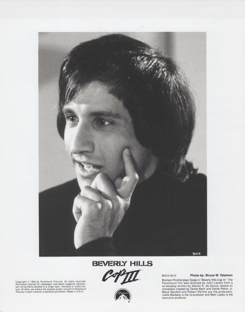 This vintage Hollywood Paramount photograph features Bronson Pinchot in Beverly Hills Cop III (1994). The black and white image measures 8 x 10 inches and is an original gelatin-silver print. The photograph is unframed and is a single piece.