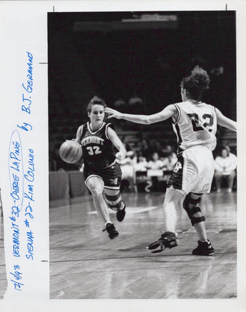 This rare and unique photograph captures the essence of the basketball sport in an antique black and white gelatin-silver print. The image showcases two featured persons, Carrie La Pine and Kim Colunio, in a competitive game with a basketball theme. Measuring 8 x 10 inches in size, this original production technique was made in the United States in 1993.