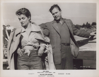 This stunning black and white photograph captures the iconic actress Jane Russell and her co-star Ralph Meeker in their roles as Betsy and Charlie in the 1957 film "The Fuzzy Pink Nightgown." The photograph measures 8 x 10 inches and is an original gelatin-silver print that has been unframed.