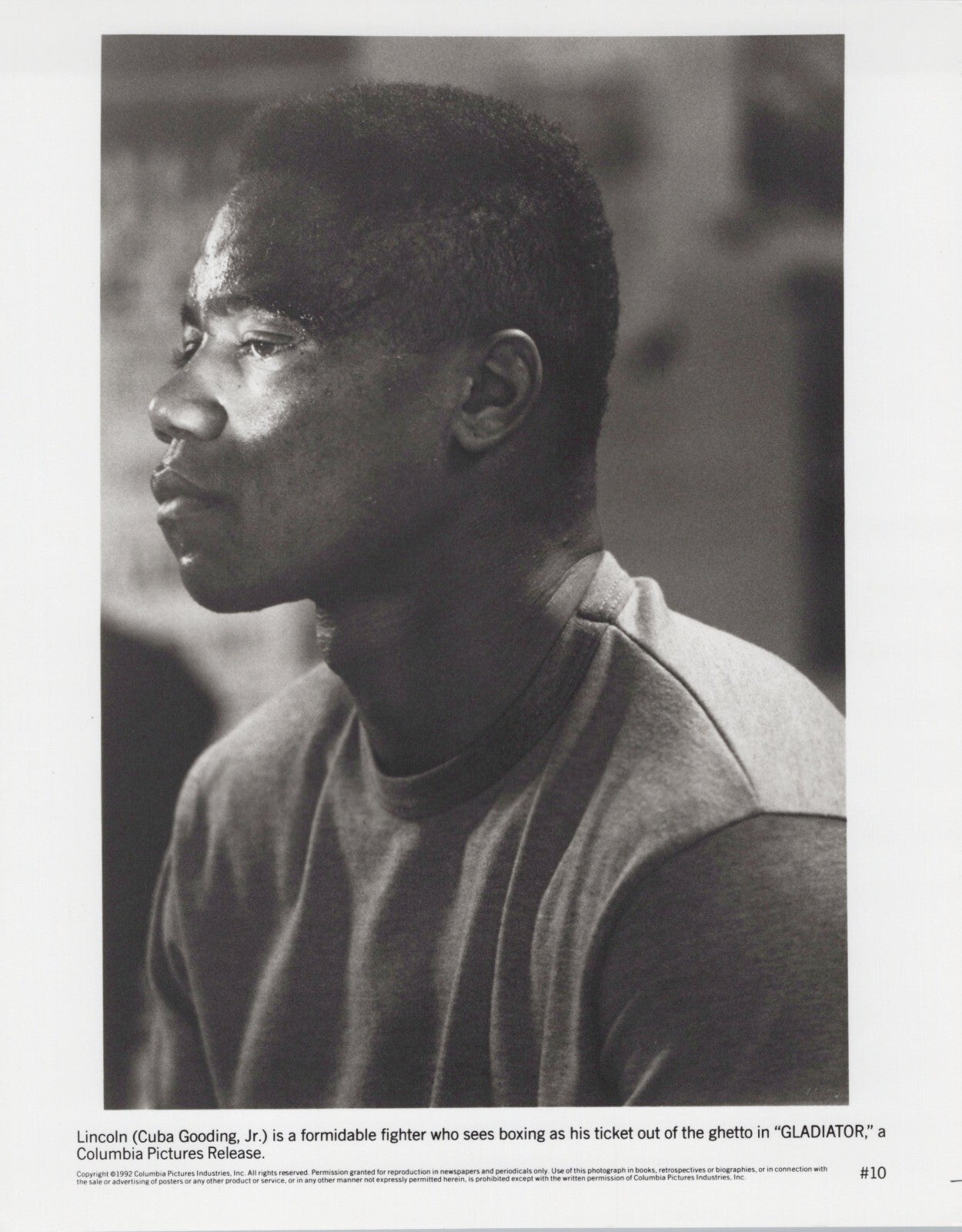 This stunning 8 x 10 inch black and white photograph features the talented Cuba Gooding Jr. in a memorable scene from the 1992 Hollywood movie Gladiator. The photograph is an original gelatin-silver print, with a glossy finish, and is sold as a single piece. It is a vintage collectible and would make an excellent addition to any collection of Hollywood memorabilia.