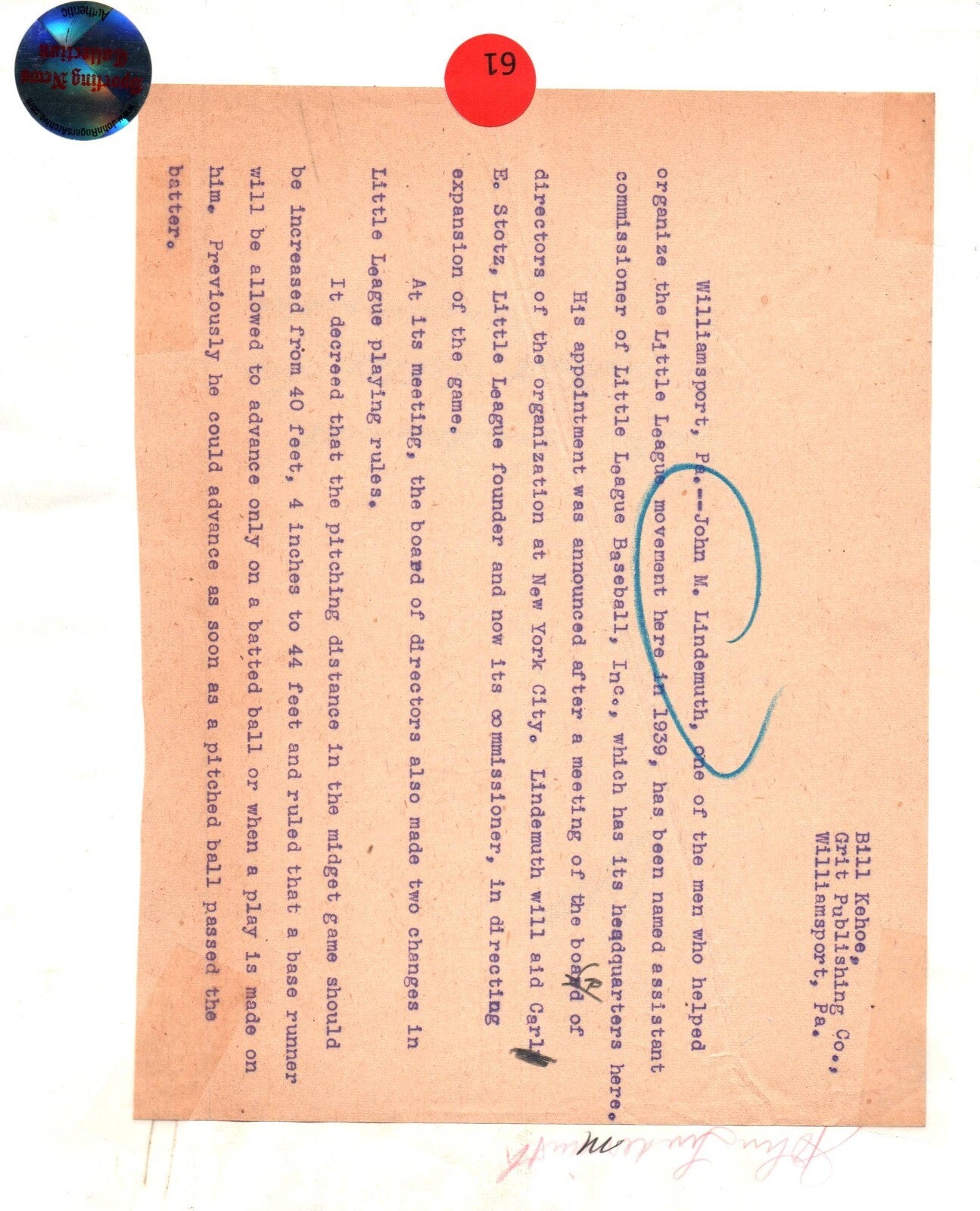 1950s JOHN M. LINDEMUTH LITTLE BASEBALL LEAGUE FOUNDER PORTRAIT ORIG PHOTO 873