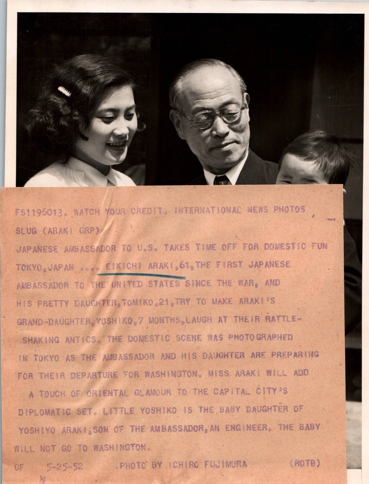 1952 Minister JAPAN AMBASSADOR Shigemitsu & daughter TOMIKO ORIG PRESS PHOTO 873