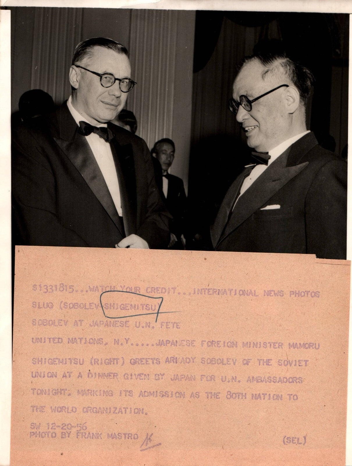 1956 Minister JAPAN AMBASSADOR Shigemitsu & ARKADY SOBOLEV ORIG PRESS PHOTO 873