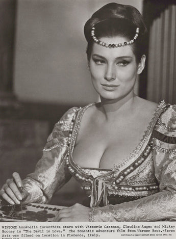 This beautiful black and white gelatin-silver print photograph features the stunning actress Annabella Incontrera, known for her role in The Devil in Love (1968) produced by Warner Bros. The photograph measures 7 x 10 inches and is an original production technique that showcases the actress's beauty in a vintage Hollywood style.