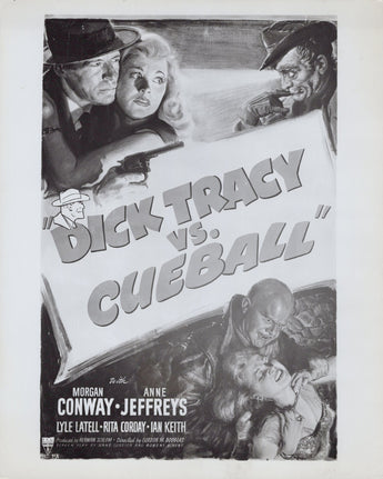 This vintage photograph captures the dynamic duo of Anne Jeffreys and Morgan Conway in the 1946 film "Dick Tracy vs. Cueball." The black and white image measures 8 x 10 inches and is an original gelatin-silver print from the United States. It features the two actors in character, as well as the classic Hollywood theme of crime-fighting and detective work. The photograph is perfect for collectors of movie memorabilia or fans of vintage Hollywood.
