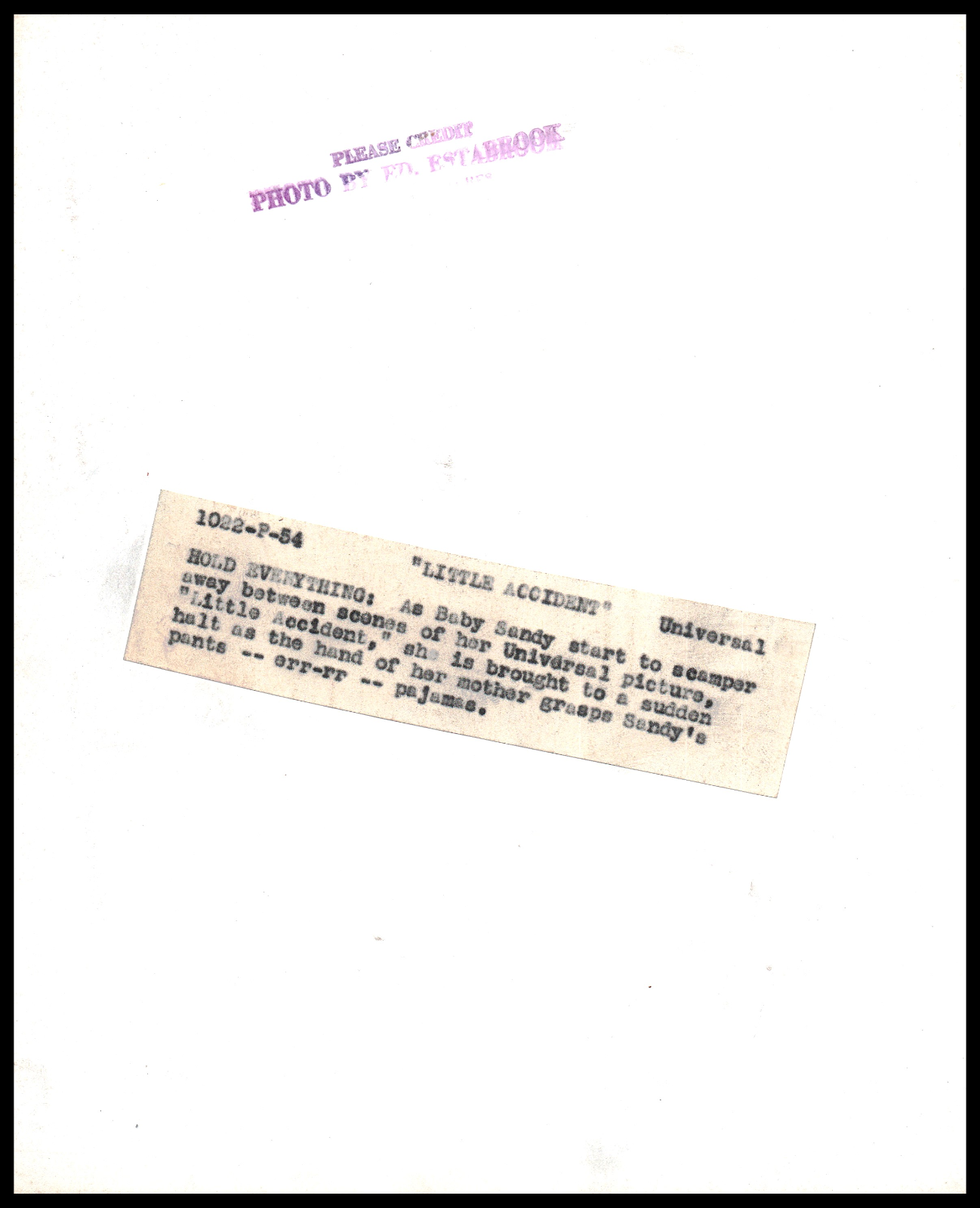 This vintage photo, taken by Ed. Estabrook, beautifully encapsulates the innocence and charm of Baby Sandy in "Little Accident." The image quality is wonderfully preserved, highlighting intricate details and nostalgic tones. This original gem holds a piece of cinematic history that embodies the magic of childhood in classic cinema.