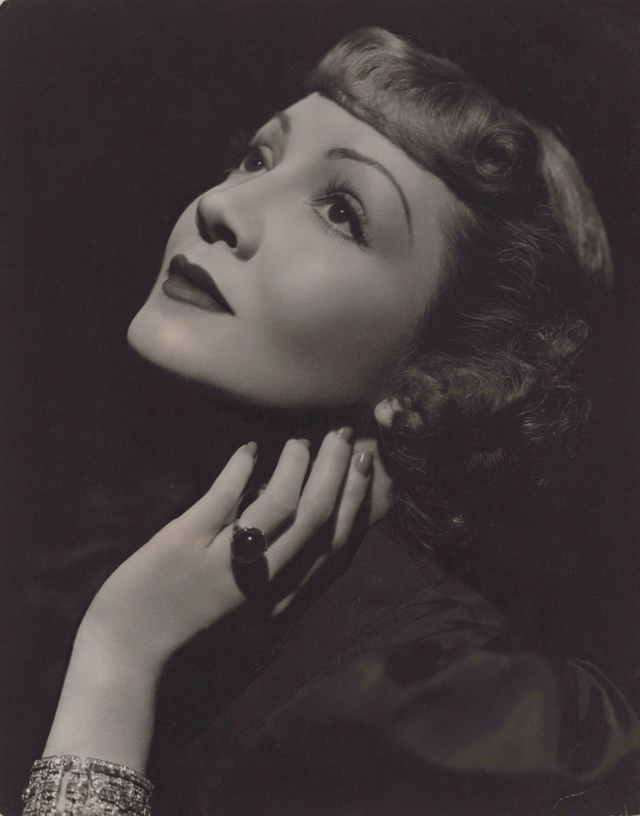 This vintage photograph beautifully captures the elegance and allure that made Claudette Colbert an enduring icon of the silver screen.