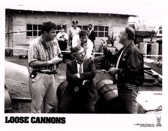 Capture the brilliance of two of Hollywood's finest actors, Dan Aykroyd and Gene Hackman, in this vintage black and white photograph. Taken during the production of their 1989 film "Loose Cannons," the 10 x 8 in glossy gelatin-silver print showcases the dynamic duo in action. This original photo depicts the actors in character, highlighting their on-screen chemistry and talent. Ideal for collectors of Hollywood memorabilia, this unframed photograph is a must-have for fans of the two legendary actors. With its timeless appeal, this single piece will make an excellent addition to any collection of photographs, photographic images, or collectibles. Don't miss the chance to own a piece of Hollywood history!