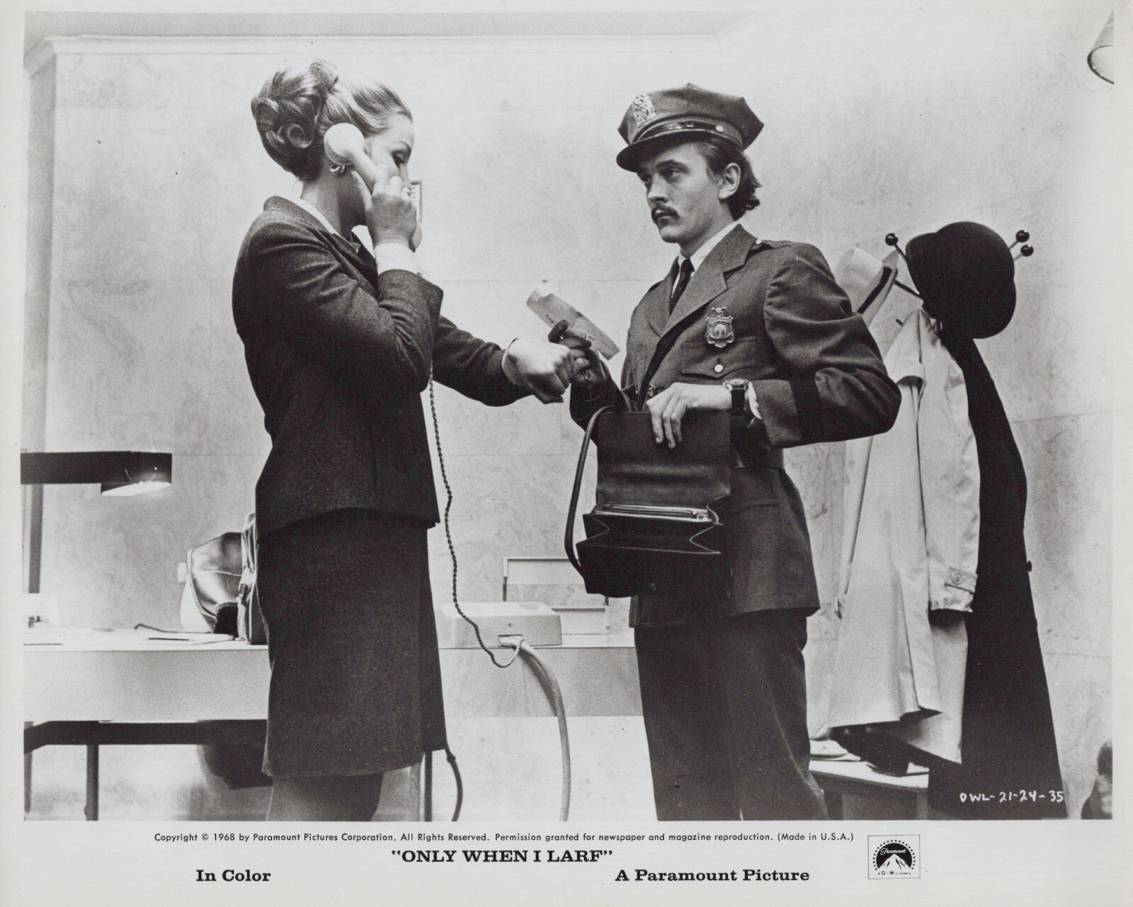 This vintage black and white gelatin-silver print photograph features the talented actors David Hemmings and Alexandra Stewart in a scene from the 1968 movie "Only When I Larf". The photo measures 10 x 8 inches and is printed on paper. It is an original production technique and has not been reprinted or licensed.