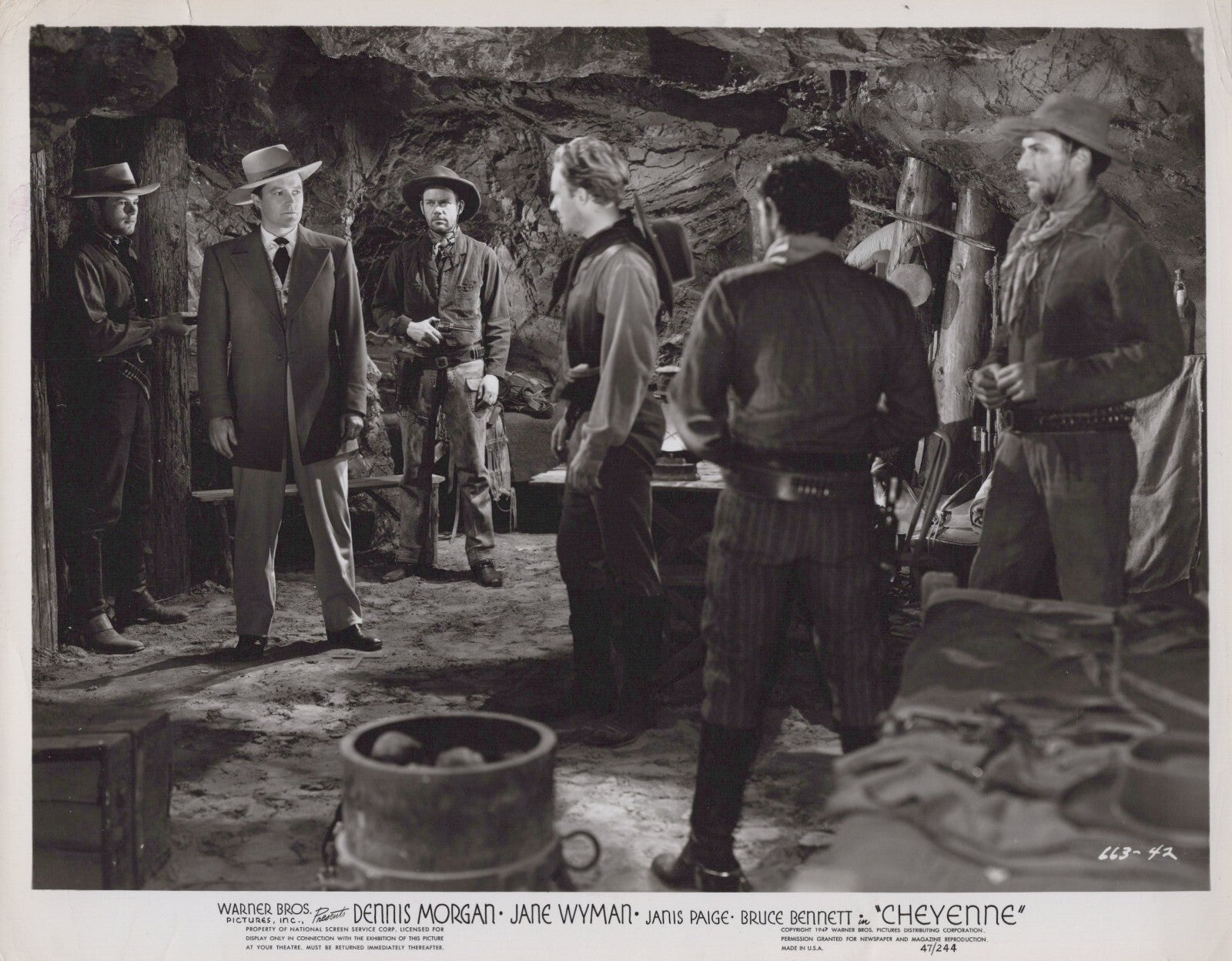 This is an original black and white gelatin-silver print photograph of actors Dennis Morgan and Bruce Bennett in the 1957 Warner Bros movie "Cheyenne". The photograph measures 10 x 8 inches and features the two actors in character. It is an antique piece, produced in the United States and is a licensed original, not a reprint.