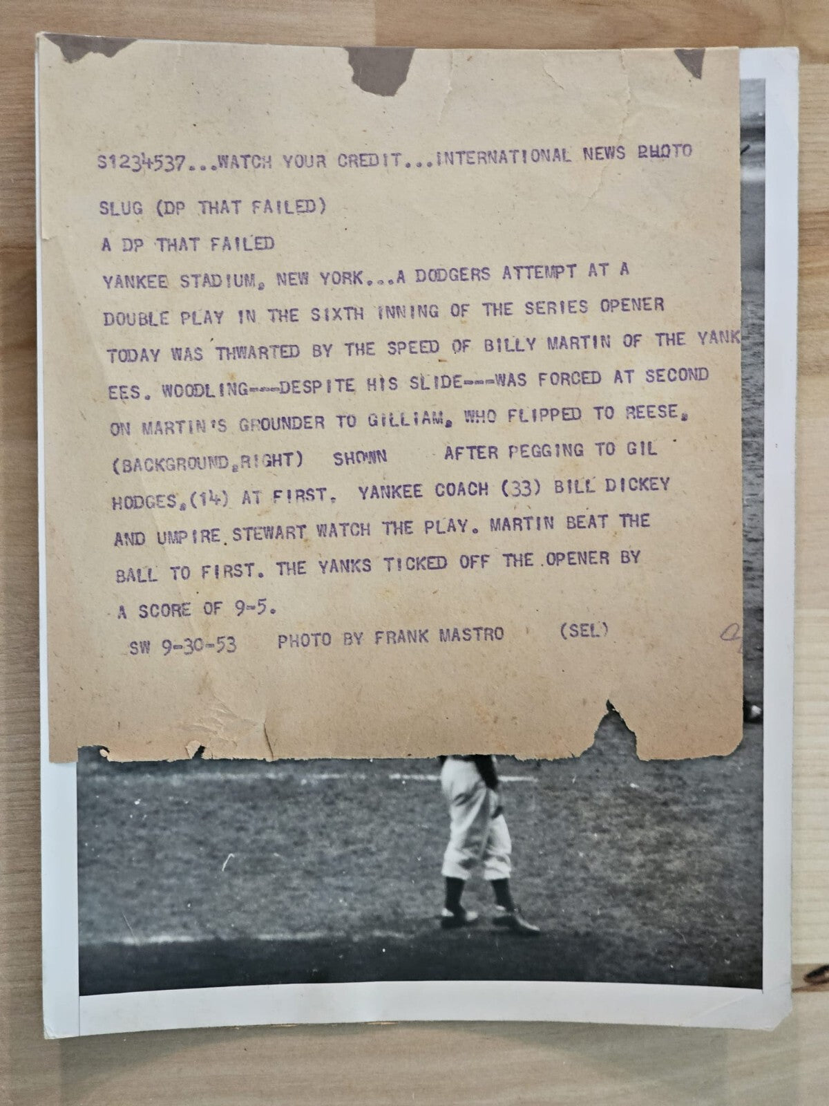 DODGERS 1953 BASEBALL DOUBLE PLAY YANKEES BILL DICKEY ORIG MASTRO ORIG PHOTO 873