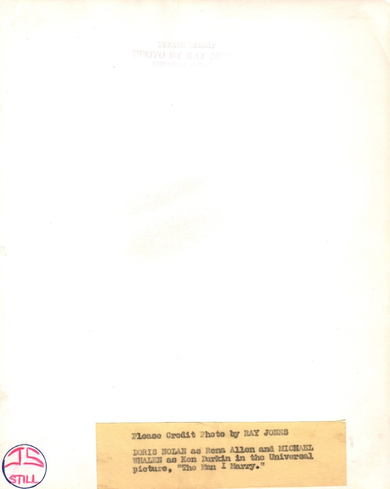 This photo encapsulates the magic of Doris Nolan and Michael Whalen's on-screen romance in "The Man I Marry," captured through the lens of the esteemed Ray Jones. Whether you're a dedicated collector or a fan of classic Hollywood love stories, this vintage piece adds a touch of timeless romance to your collection.