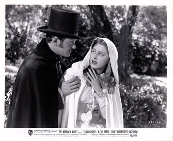 Journey into the captivating narrative of 'The Woman in White' (1948) with this vintage Warner Bros. movie photo showcasing the enchanting pairing of Eleanor Parker and Gig Young. Immerse yourself in the allure of classic cinema with this rare snapshot, capturing a moment of cinematic brilliance and the convergence of two talented actors in a timeless tale.