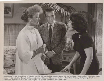 Description: Step back in time to the glamour of the 1950s with this extraordinary vintage photograph featuring the iconic Elizabeth Taylor and the legendary Katharine Hepburn in the classic film "Suddenly, Last Summer."