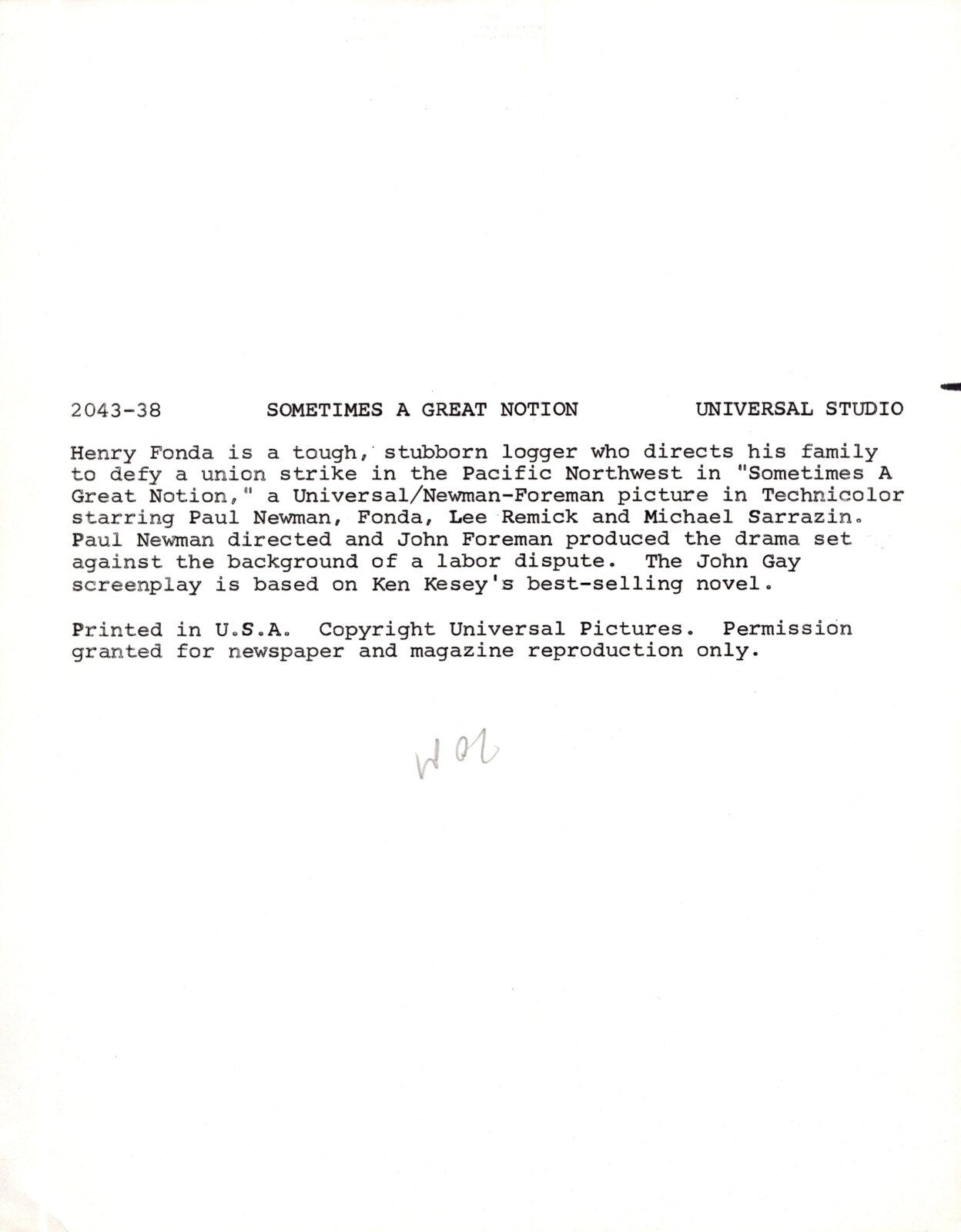 This stunning black and white photograph features the legendary Henry Fonda in his iconic role in the 1971 movie Sometimes a Great Notion. Measuring 7 x 9 inches and printed on high-quality paper using the gelatin-silver technique, this original and licensed reprint is a must-have for any serious collector of Hollywood memorabilia. The image captures Fonda in character, alongside other notable actors and actresses, set against a backdrop that showcases the beauty of the Pacific Northwest. This unique piece celebrates the movie and its theme of family, loyalty, and the great American spirit.