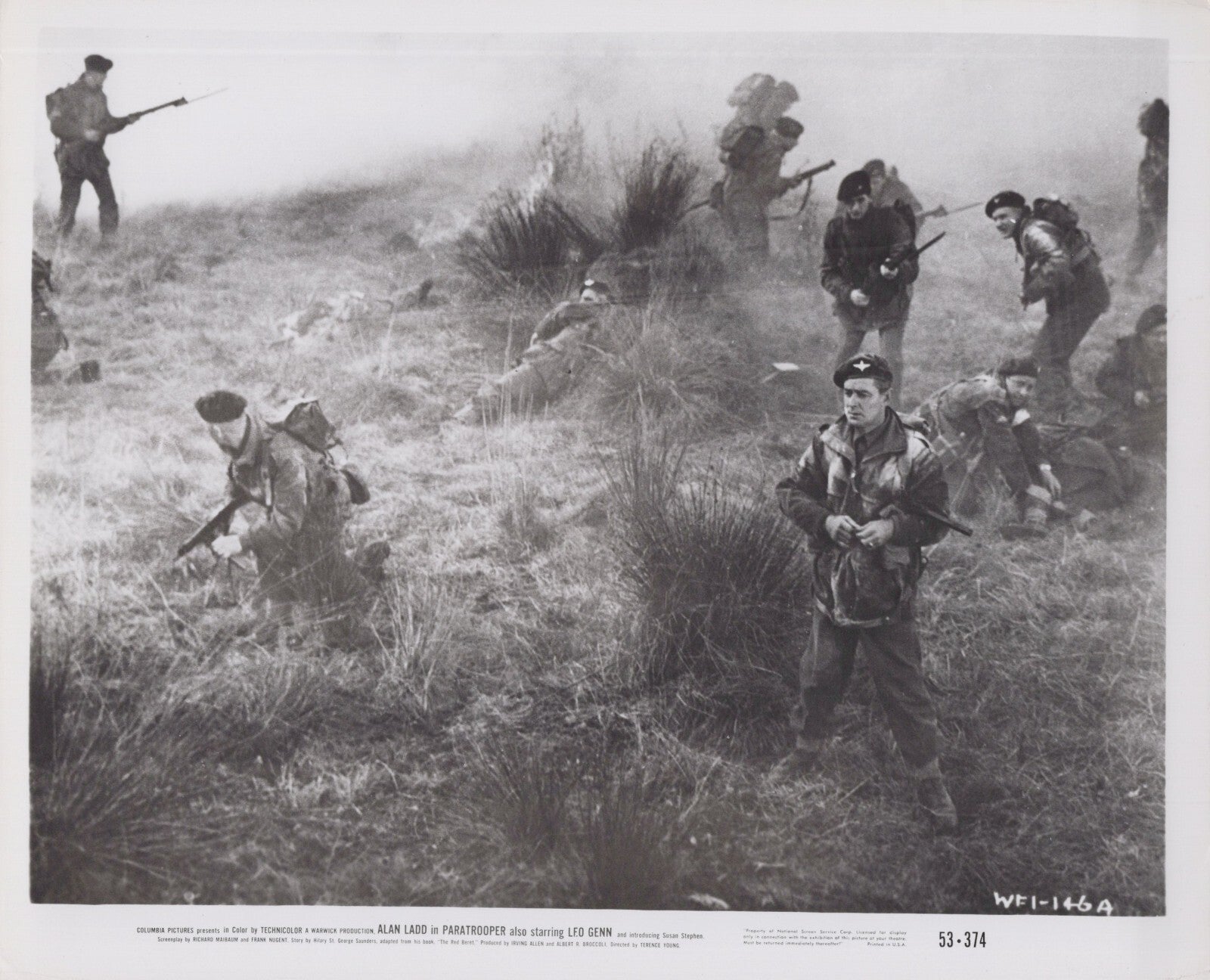Keywords: Alan Ladd Paratrooper 1953 photo, The Red Beret movie still, Terence Young war drama, vintage war movie collectible, 1950s Hollywood memorabilia, Alan Ladd action film image, classic World War II film photo.