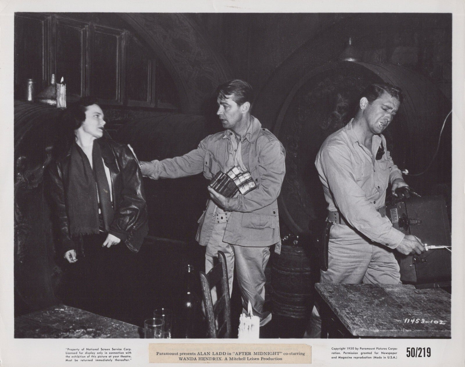 Keywords: Alan Ladd After Midnight 1950 photo, Wanda Hendrix movie still, noir thriller film memorabilia, classic crime drama collectible, vintage Hollywood photograph, 1950s film noir star image, Alan Ladd noir classic.