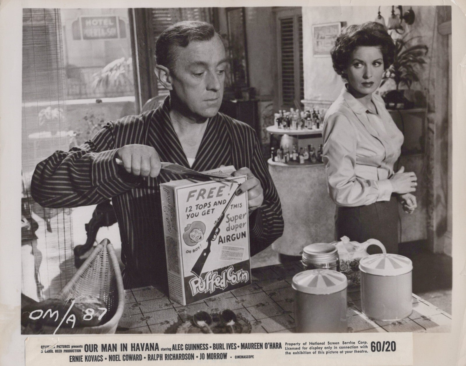 Alec Guinness, Maureen O’Hara, Our Man in Havana, 1959 movie still, Carol Reed films, Graham Greene adaptations, vintage film photo, classic cinema collectibles, spy comedy films, old Hollywood memorabilia, Alec Guinness rare photos, Maureen O’Hara collectibles, pre-revolutionary Cuba movies, classic thriller comedy, British cinema legends, vintage movie memorabilia.