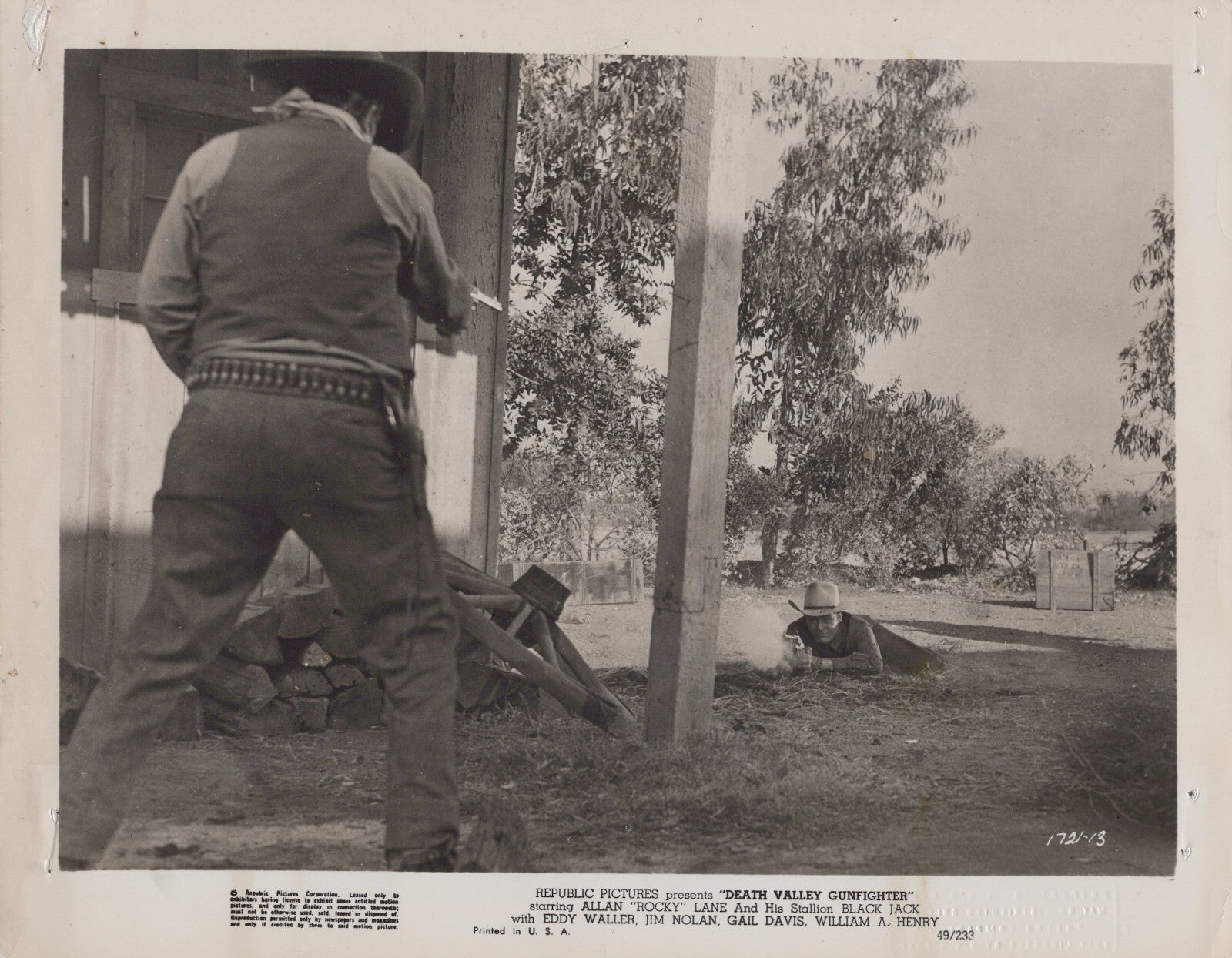 Allan Lane Death Valley Gunfighter, 1949 Western movie photo, Republic Pictures vintage photograph, classic cowboy movie memorabilia, Allan Lane Western film collectible, 1940s Western movie star photo, black-and-white Western photography, Death Valley Gunfighter film still, Republic Pictures Allan Lane, vintage cowboy cinema memorabilia, Allan Lane rare photo, Death Valley vintage Western collectible, Republic Pictures cowboy star photo, 1940s Western film memorabilia, vintage Allan Lane photograph.