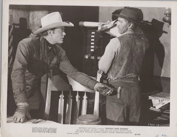 A striking original vintage movie still from the 1949 Western classic Navajo Trail Raiders. This image highlights the legendary Allan Lane, known for his dynamic presence in action-packed cowboy adventures. A must-have for fans of Republic Pictures' golden era and Western film memorabilia enthusiasts.