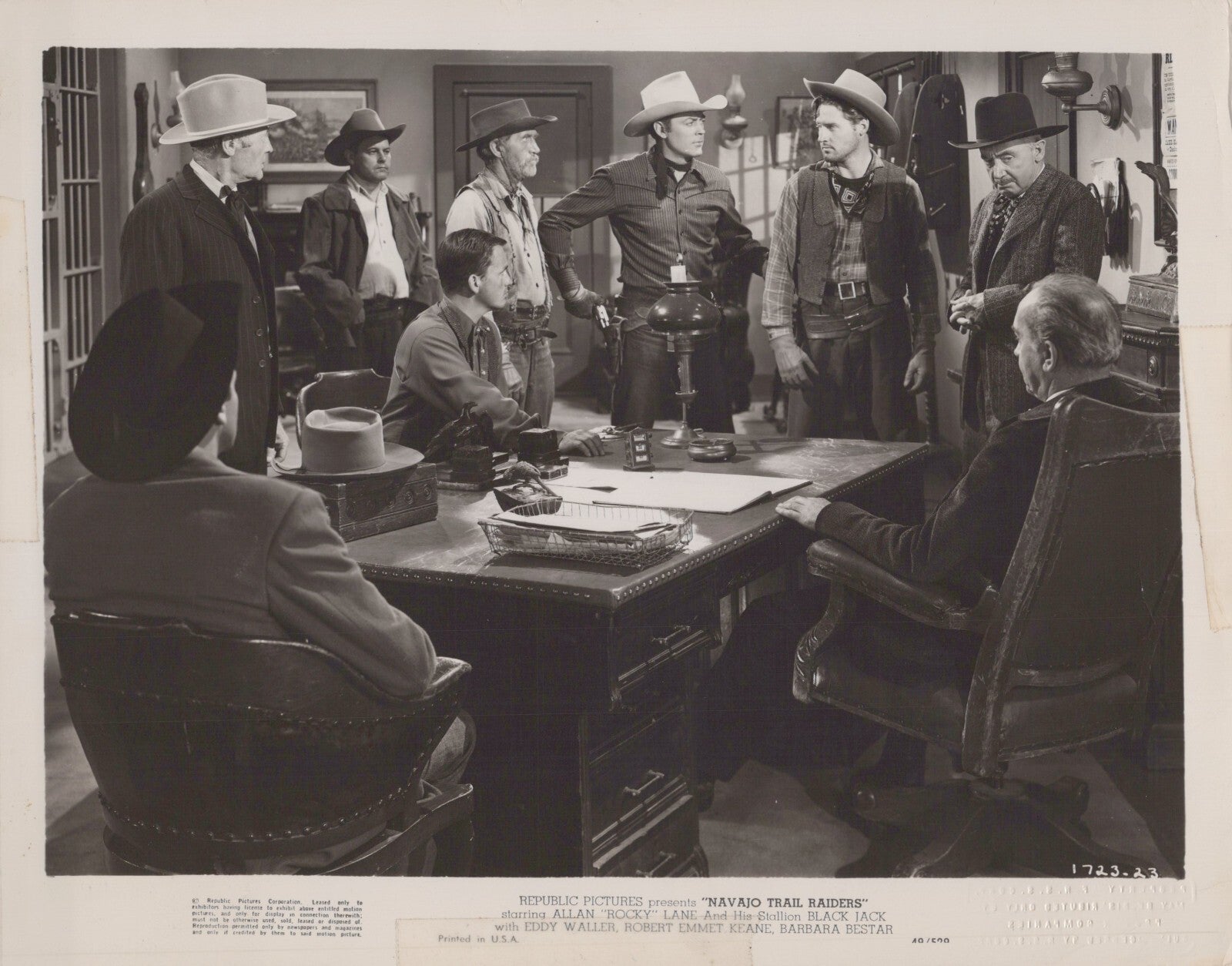 Allan Lane Navajo Trail Raiders 1949, vintage Western movie photo, Republic Pictures film still, Allan Lane cowboy collectible, 1940s Western memorabilia, classic black-and-white Western photo, Navajo Trail Raiders vintage photograph, Allan Lane rare photo, Republic Pictures Allan Lane collectibles, Allan Lane cowboy action scene, collectible Western cinema memorabilia, Navajo Trail Raiders film still, Allan Lane iconic Western actor, Republic Pictures 1949 cowboy movie, vintage Allan Lane movie still.