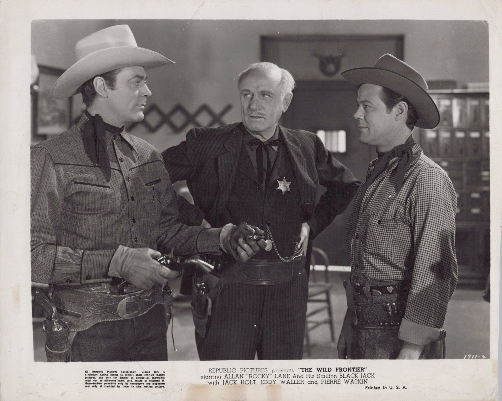 This classic film still features Allan "Rocky" Lane alongside John James in the 1947 Western The Wild Frontier. A thrilling tale of bravery and justice in the Old West, this Republic Pictures production highlights Lane’s heroic character and James’s compelling presence as they navigate the dangers of frontier life.