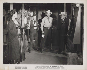 Keywords: Bill Elliott, Lorna Gray, Forrest Tucker, The Last Bandit 1949, vintage Western photo, cowboy movie memorabilia, original studio still, rare 1940s Hollywood, classic Western film collectible.