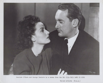 Step into the world of wartime cinema with this vintage studio-issued photograph featuring Maureen O’Hara and George Sanders from the acclaimed 1943 film This Land Is Mine. Directed by Jean Renoir, this classic drama highlights the resilience of ordinary people during extraordinary times, with unforgettable performances by two of Hollywood’s most iconic stars.