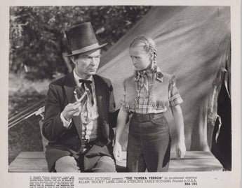 This rare vintage still from the 1945 Western The Topeka Terror showcases Earle Hodgins and Twinkle Watts, two iconic stars of the era. In this thrilling action-packed film, Hodgins plays his usual gritty and reliable character, while Watts shines with her distinctive charm and screen presence. Together, they bring to life the excitement of the Old West in a timeless story of adventure, danger, and suspense.