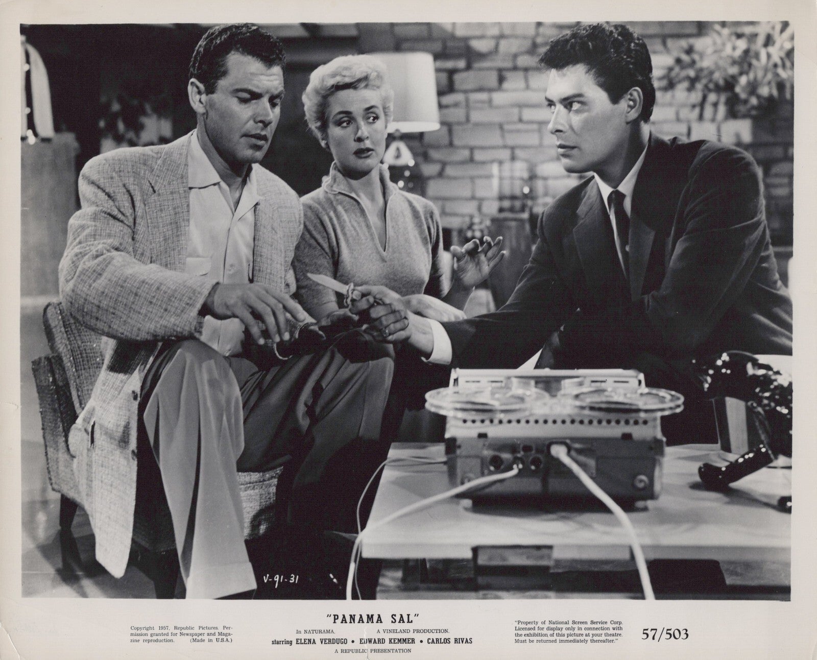 Ed Kemmer photo, Carlos Rivas vintage still, Elena Verdugo movie photo, Panama Sal 1957 memorabilia, classic adventure film collectible, rare movie photo, 1950s Hollywood still, original film photograph, vintage Latin American cinema, Ed Kemmer collectible.