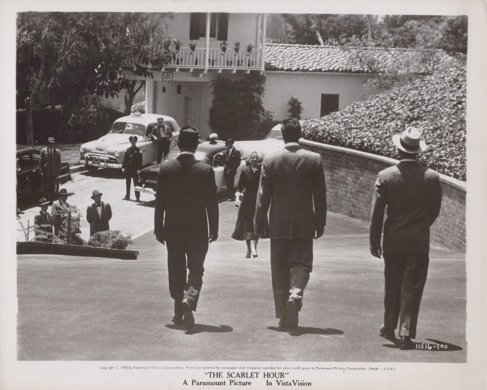 This original vintage still from The Scarlet Hour (1956) features Edward Binns, E.G. Marshall, Carol Ohmart, and Tom Tryon in a key scene from the tense and atmospheric film noir directed by Michael Curtiz. The film tells a gripping story of crime, betrayal, and passion, with Ohmart delivering a standout performance in her film debut.