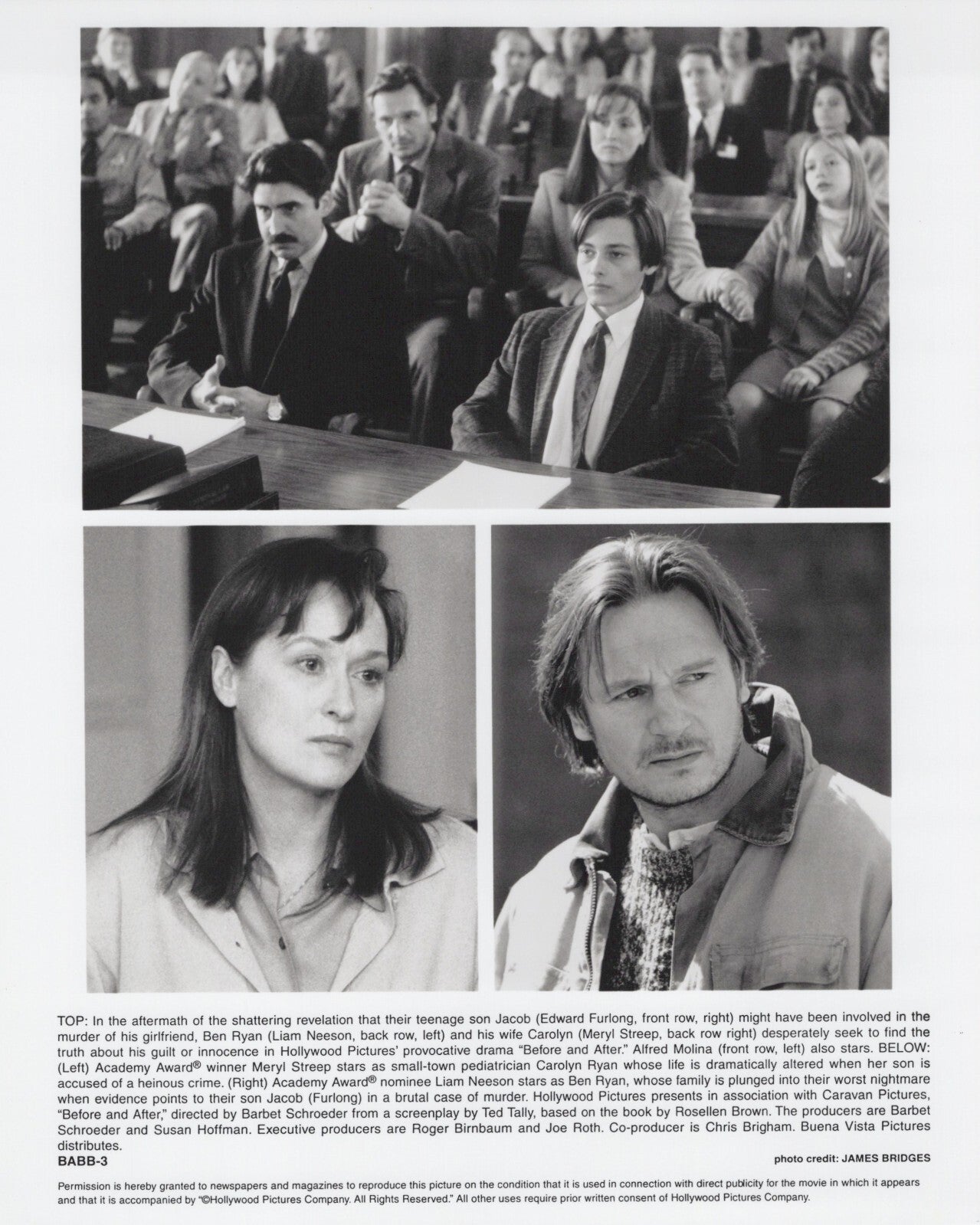 Edward Furlong Alfred Molina Liam Neeson Meryl Streep Julia Weldon Before and After 1996 photo, rare drama movie still, 90s thriller film collectible, Meryl Streep and Liam Neeson promotional photo, original movie still with Edward Furlong.