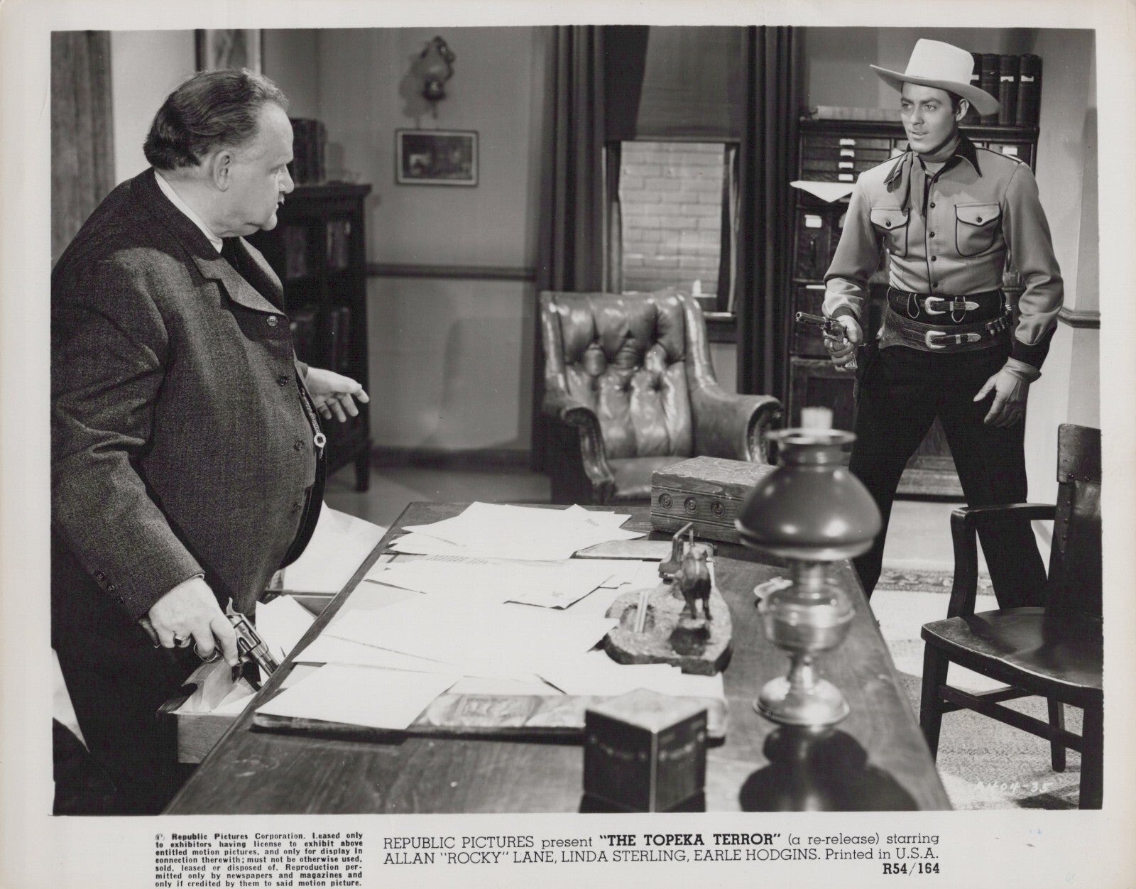 Allan Lane The Topeka Terror photo, Frank Jaquet Republic Pictures, 1945 Western movie still, vintage Allan Lane Western collectible, Republic Pictures memorabilia, classic Western film photography, mid-century cowboy cinema, Howard Bretherton Western movie scene, The Topeka Terror collectible photo.
