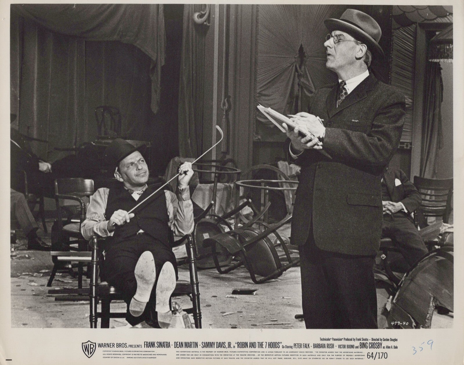 Frank Sinatra, Hans Conried, Robin and the 7 Hoods, 1964, vintage movie photograph, classic Hollywood musical, 1960s comedy film, Sinatra memorabilia, rare movie still, Golden Age cinema, vintage film photo.