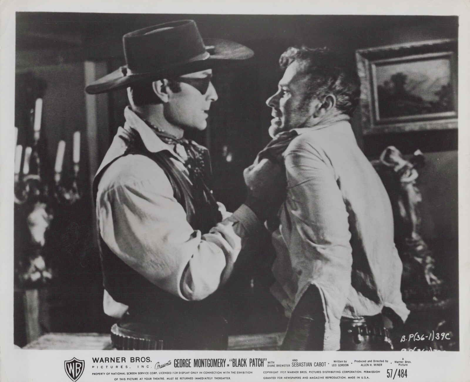 George Montgomery Black Patch photo, 1957 Western movie still, vintage film collectibles, classic Hollywood photography, black-and-white Western movie photo, Black Patch memorabilia, cowboy movie memorabilia, 1950s cinema treasures, collectible Western film stars, George Montgomery collectibles.
