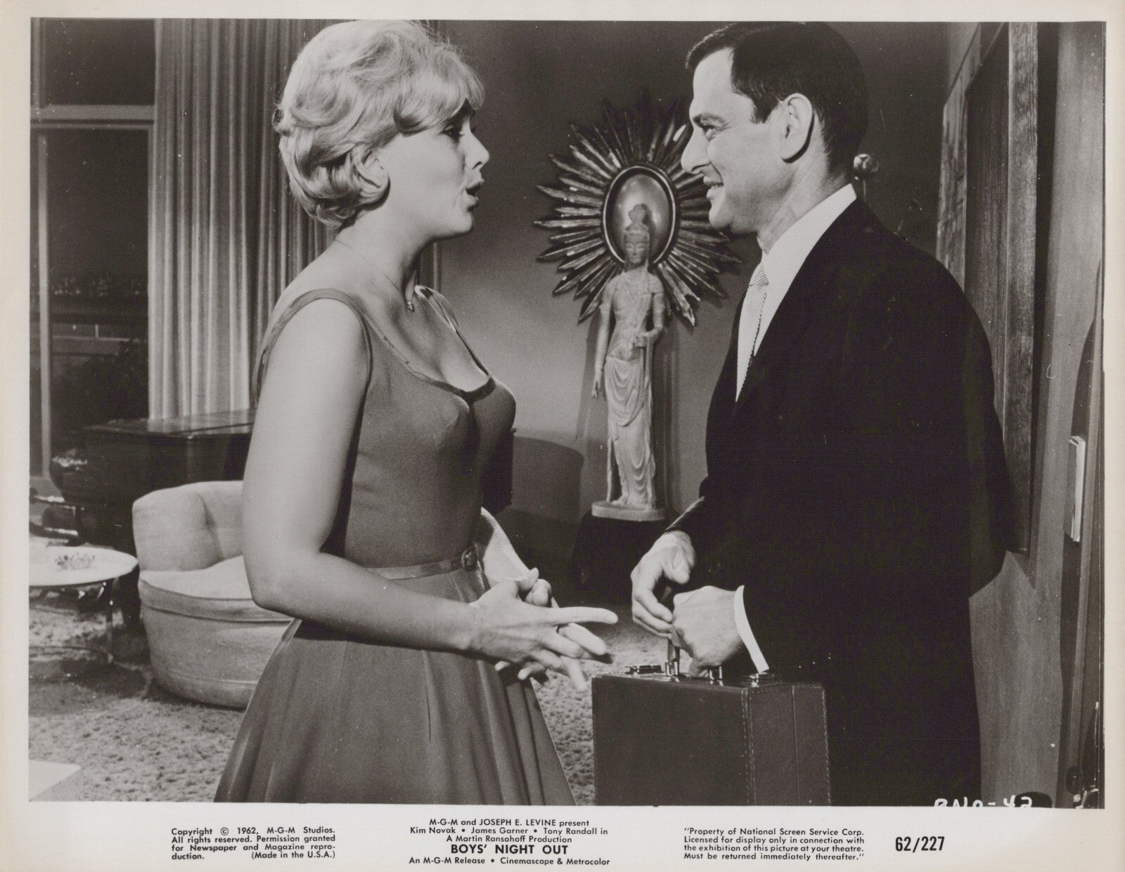 James Garner, Kim Novak, Boys' Night Out, 1962, vintage photography, classic Hollywood memorabilia, romantic comedy film still, 1960s cinema, rare movie still, vintage stars, James Garner photo, Kim Novak collectible, 1960s romantic comedy.