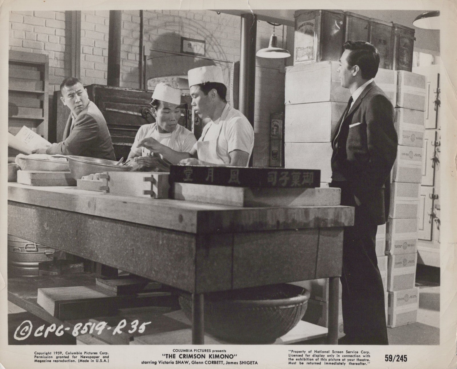 Keywords: James Shigeta The Crimson Kimono, 1959 crime drama still, film noir photo, vintage Hollywood, Sam Fuller film, original press photograph, 50s detective film, classic crime thriller collectible.