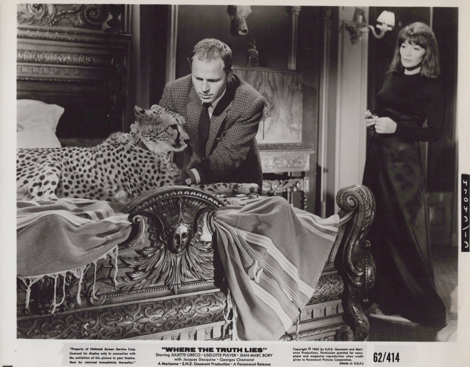 Jean-Marc Bory, Juliette Gréco, Nyète, Where the Truth Lies, 1962, vintage French film still, rare film photograph, French cinema, classic European film, 1960s drama, French New Wave, Juliette Gréco photograph, movie memorabilia.