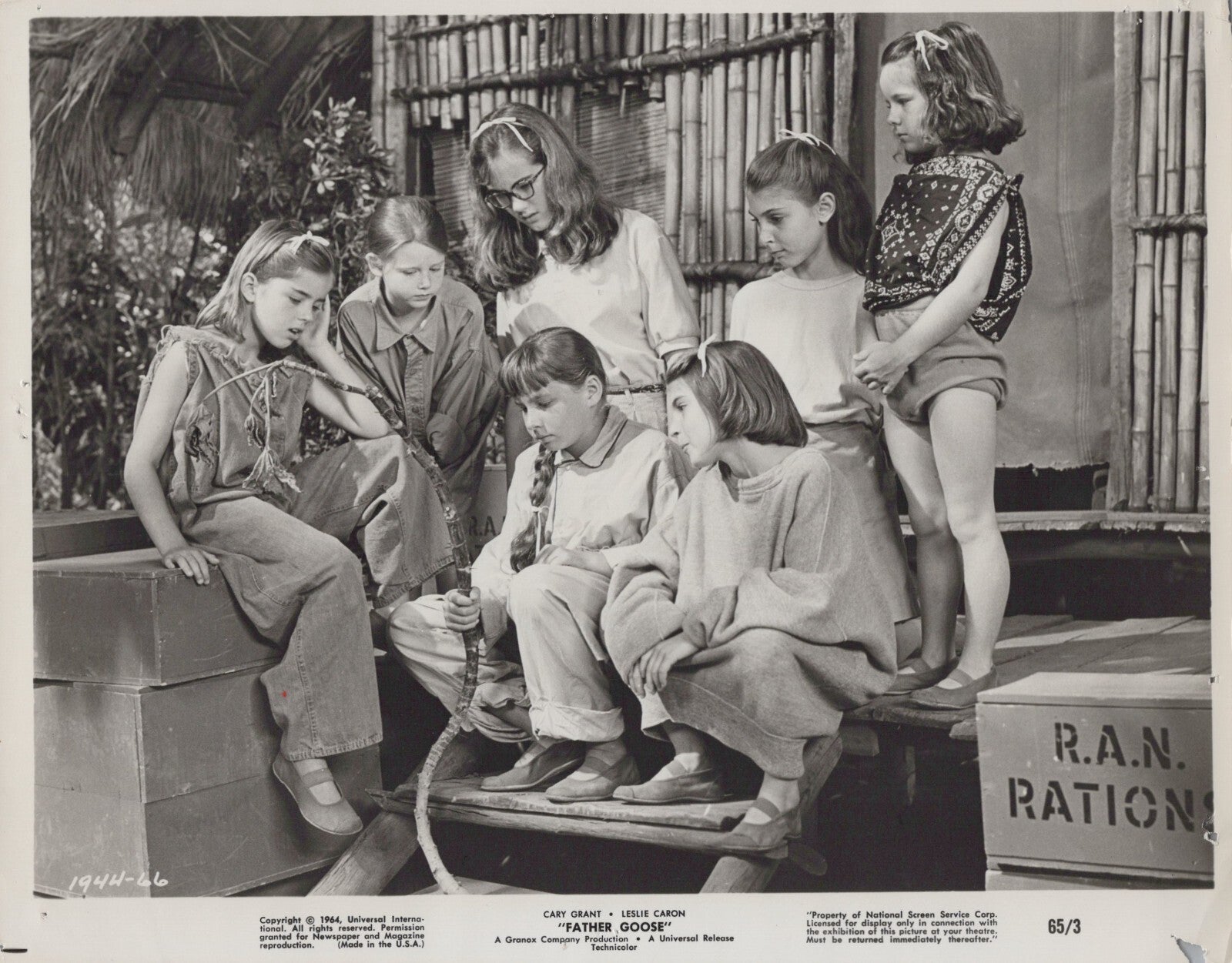Father Goose, 1964, Jennifer Berrington, Stephanie Berrington, Laurelle Felsette, Nicole Felsette, Verina Greenlaw, Sharyl Locke, Pip Sparkes, vintage movie still, classic Hollywood comedy, 1960s film memorabilia, rare photograph, family comedy collectible.