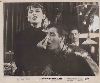 This authentic vintage photograph features Jerry Lewis and Barbara Bostock in a hilarious moment from the 1960 sci-fi comedy Visit to a Small Planet. Directed by Norman Taurog, this zany film is based on Gore Vidal’s Broadway play, where Jerry Lewis plays an eccentric alien, Commander Conroy, who lands on Earth to observe the strange behaviors of humans. His physical comedy and slapstick antics, typical of his best performances, make this film a delight for fans of 1960s sci-fi and comedy.