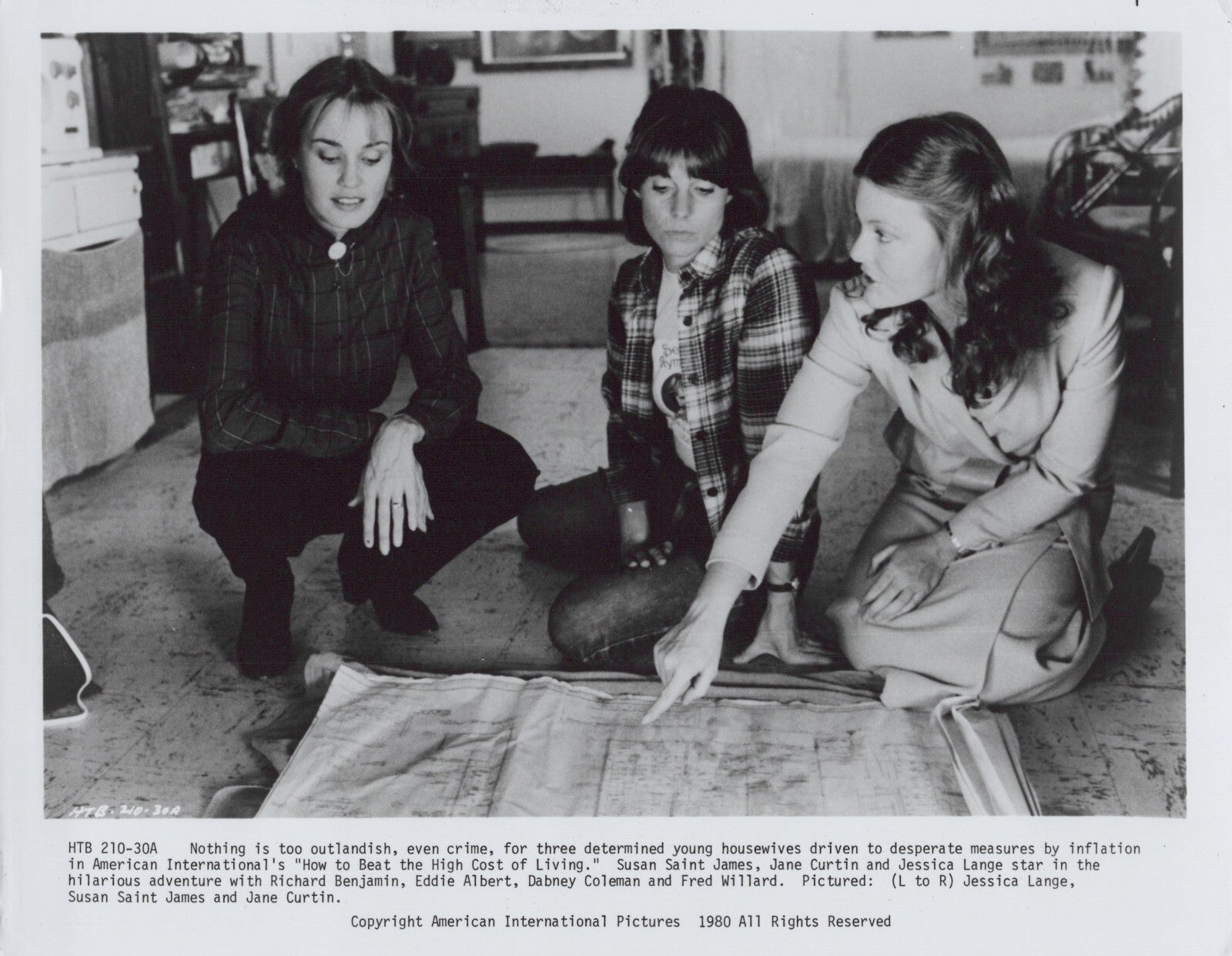 Keywords: Jessica Lange, Jane Curtin, Susan Saint James, How to Beat the High Cost of Living 1980, vintage comedy photo, 1980s film still, women-led comedy, rare movie still, classic Hollywood actresses.