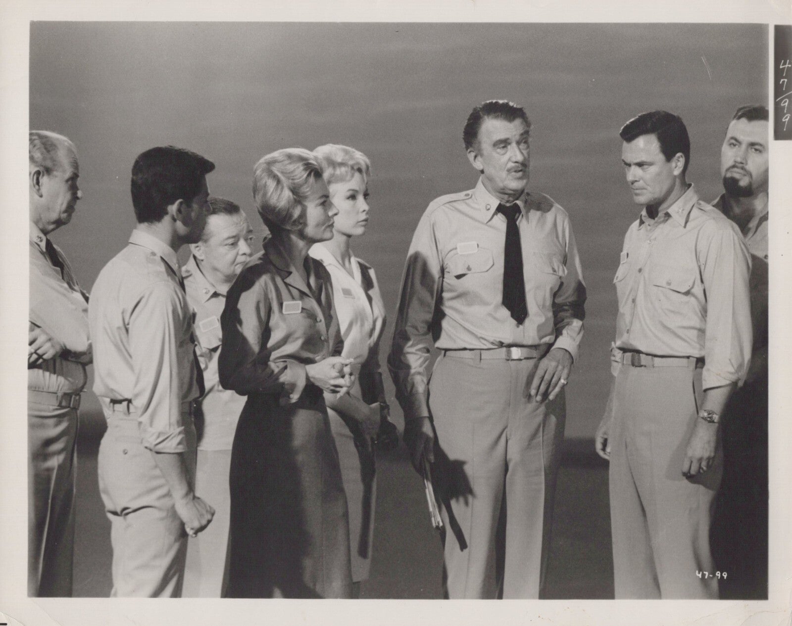 Joan Fontaine, Peter Lorre, Barbara Eden, Walter Pidgeon, Robert Sterling, Regis Toomey, Voyage to the Bottom of the Sea, 1961, vintage photography, sci-fi movie collectible, classic Hollywood memorabilia, rare movie still, underwater adventure film, retro science fiction, 1960s cinema, iconic cast photo.