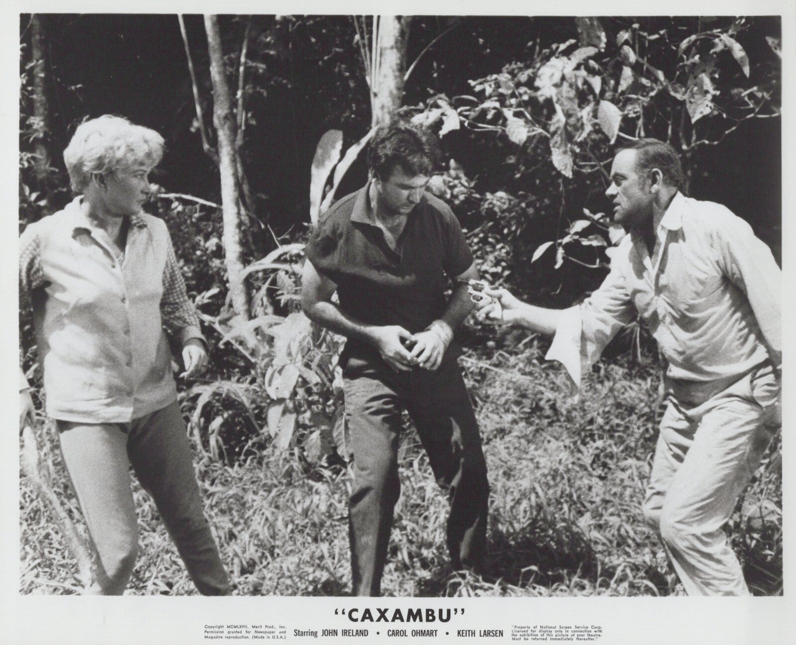John Ireland, Carol Ohmart, Caxambu, 1972, vintage movie photograph, rare adventure film, classic Hollywood, treasure hunt movies, John Ireland collectible, Carol Ohmart memorabilia, vintage cinema, exotic films, rare movie still.