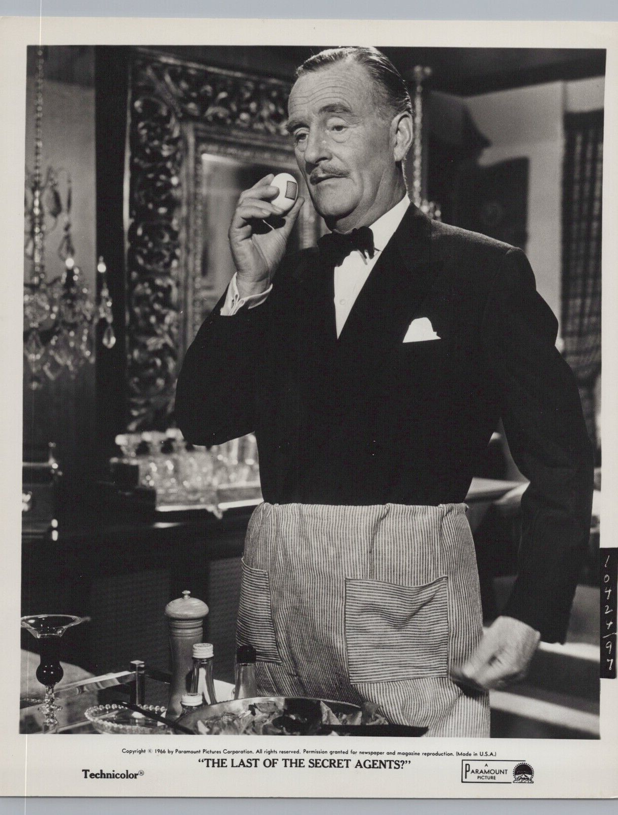 This vintage photograph features John Williams in a comedic moment from the 1966 spy spoof The Last of the Secret Agents?. Known for his suave demeanor and impeccable character acting, Williams plays his role with charm and wit, adding a touch of sophistication to the film’s humor-filled narrative.