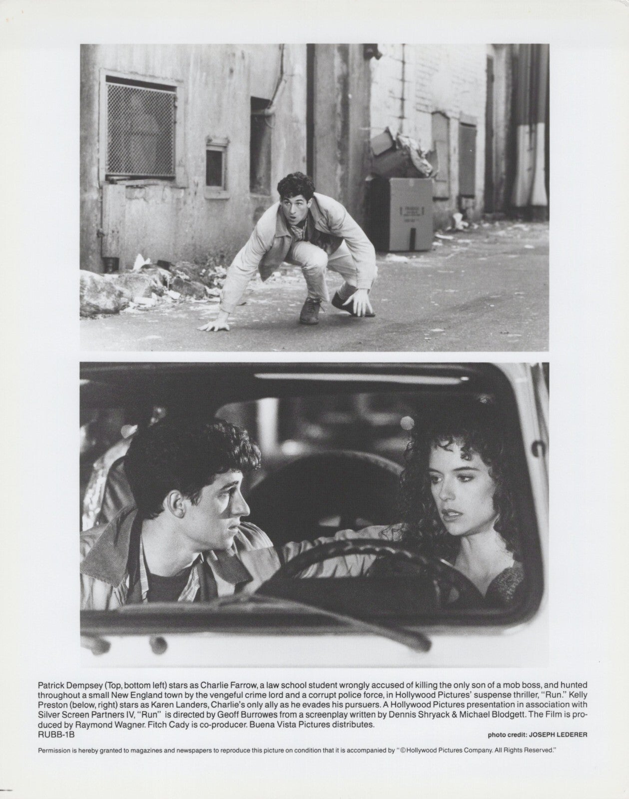 Keywords: Kelly Preston, Patrick Dempsey, Run 1991, action thriller, vintage movie photo, chase movie, '90s film collectible, crime drama, Geoff Burrowes, high-stakes action, rare cinema memorabilia.
