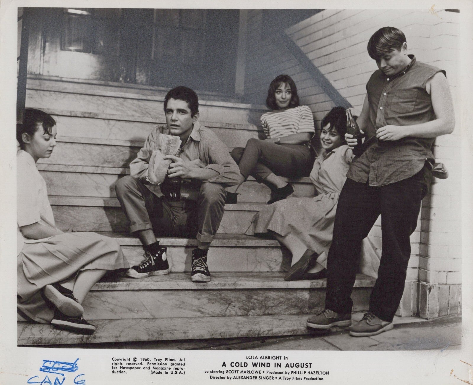 Lola Albright Scott Marlowe photo, A Cold Wind in August 1961 still, vintage film noir photography, provocative 1960s movie memorabilia, romantic drama collectible, authentic Lola Albright picture, rare cinema photograph, Alexander Singer movie collectible, classic Hollywood portrait.