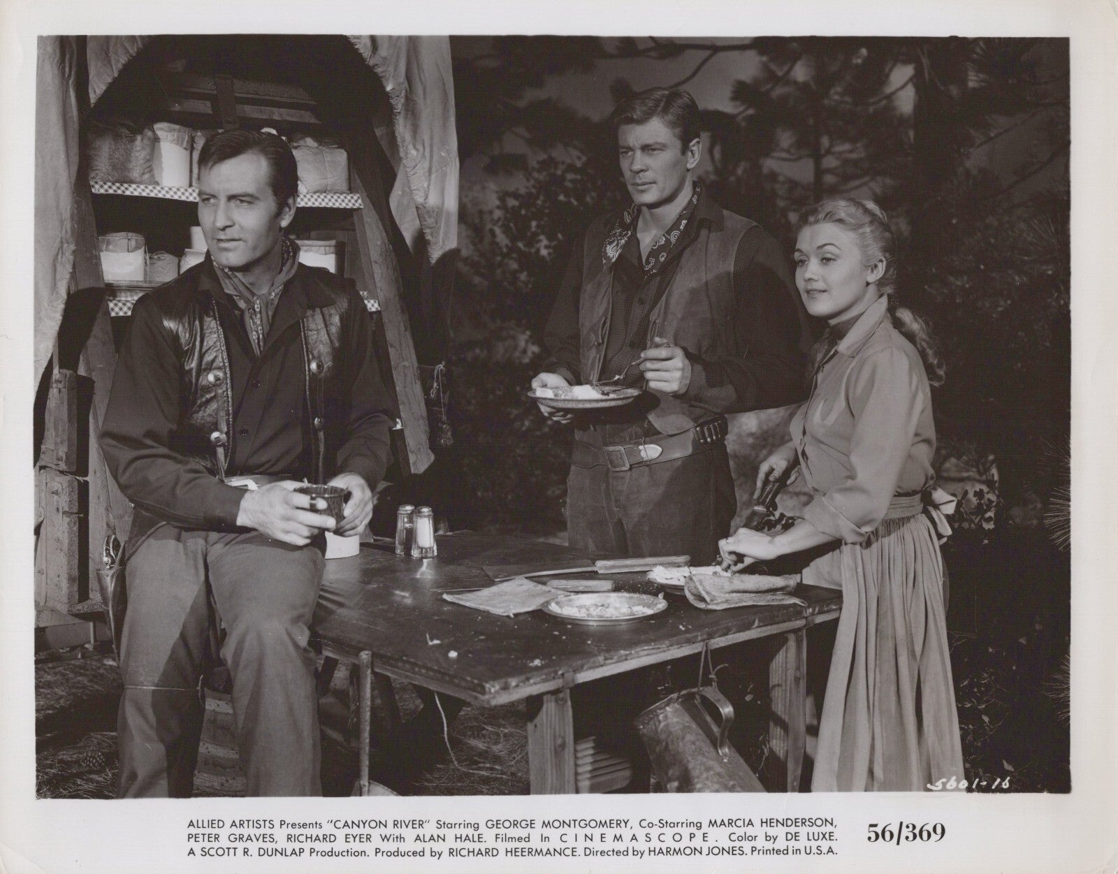 This original, unframed photograph features Hollywood actors Marcia Henderson and George Montgomery in a scene from their 1956 movie, Canyon River. The black and white image measures 8 x 10 inches and is printed on glossy paper. The vintage photograph is a single piece and is not signed.
