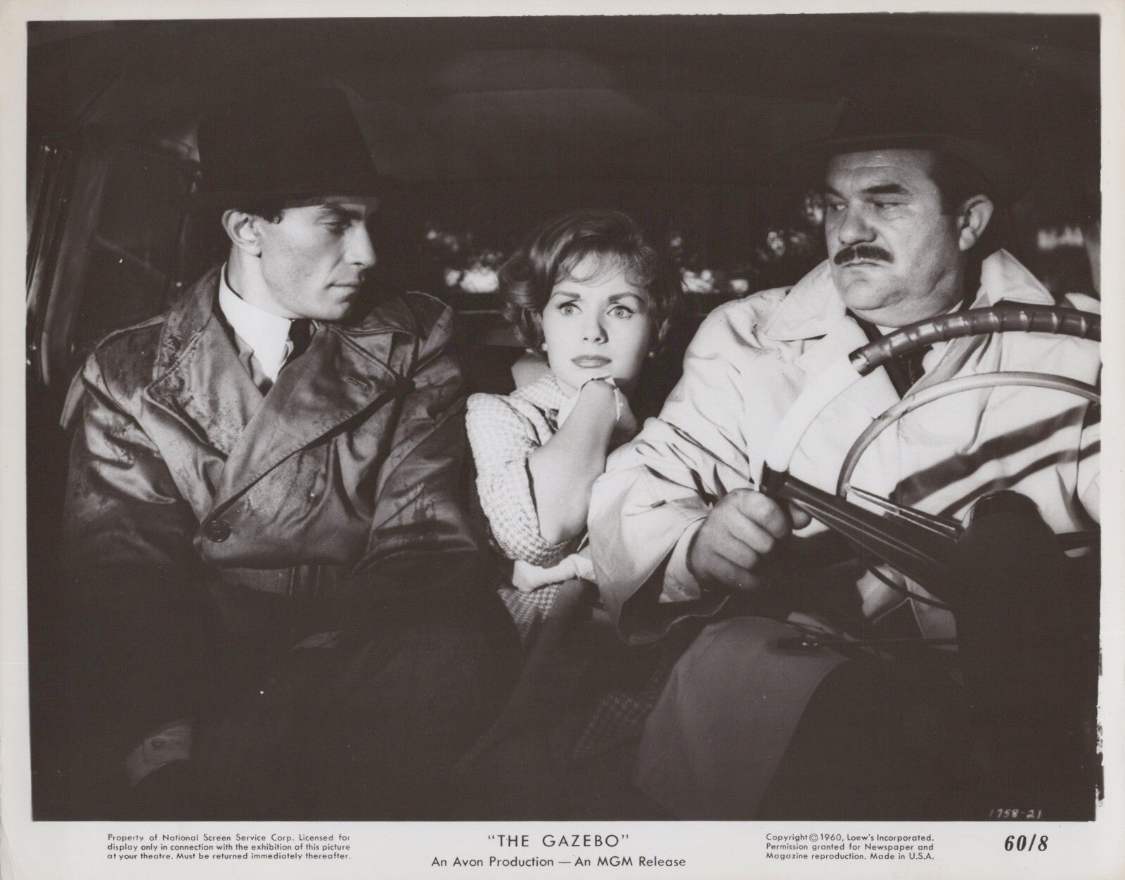 Debbie Reynolds, Martin Landau, Dick Wessel, The Gazebo 1959, classic Hollywood photograph, vintage movie memorabilia, 1950s comedies, Debbie Reynolds collectible, Martin Landau rare photo, Dick Wessel memorabilia, dark comedy films, George Marshall director, golden age of Hollywood, rare production stills, collectible cinema items, iconic vintage photography, movie history collectibles.